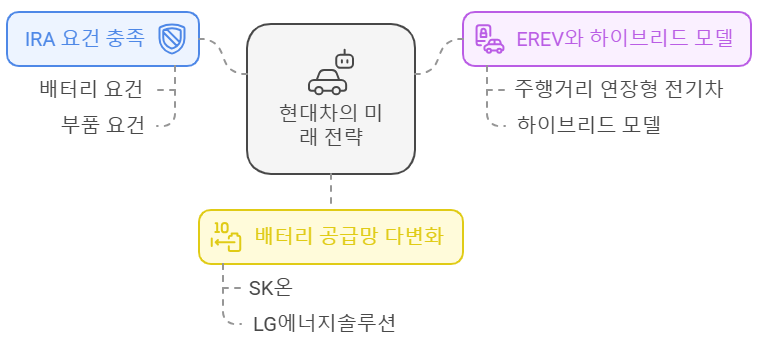- 현대차는 최근 미국 조지아주 공장(HMGMA)을 가동하며 현지 생산을 강화했지만, 배터리 부품의 현지화 비율을 즉각적으로 충족하지 못했습니다. SK온과 협력해 배터리 생산라인을 전환하고 있지만, 아직 세부 요건을 완전히 만족시키지 못한 상황입니다.