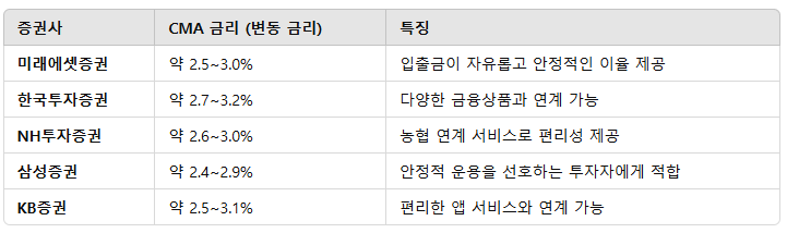 - 예금자보호: CMA 자체는 보호되지 않으나, 투자된 상품(MMF, RP 등)에 따라 다름.※
