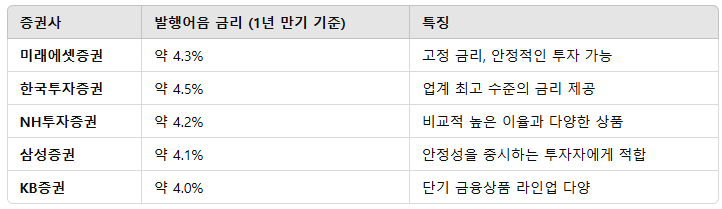 이율은 2024년 기준이며, 시장 상황에 따라 변동될 수 있습니다. 정확한 정보는 각 증권사의 공식 웹사이트나 고객센터를 통해 확인하시기 바랍니다.