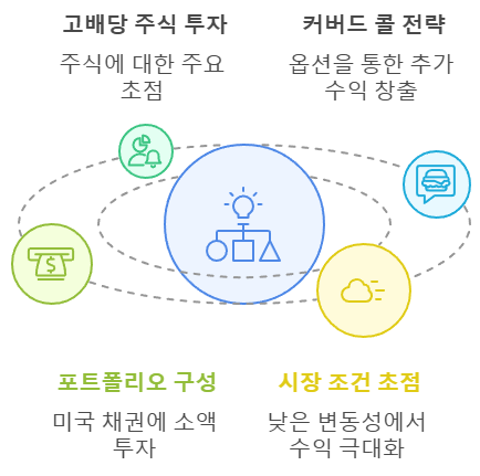 - 주식에 투자하는 동시에 커버드콜 전략을 사용하여 추가 수익을 창출하며, 안정적인 배당 수익을 목표로 합니다.