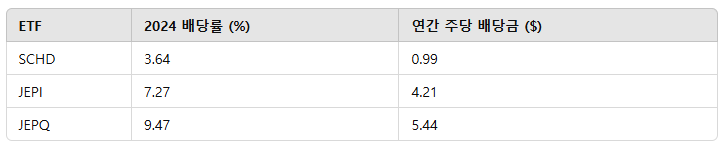아래는 2024년도 SCHD, JEPI, JEPQ ETF의 배당률과 연간 주당 배당금을 나타낸 표입니다.