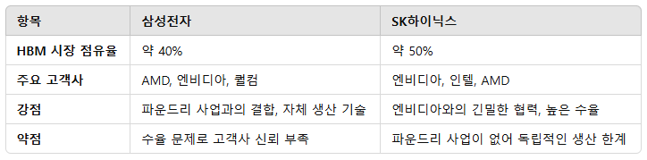 - 삼성전자는 특히 자체 파운드리 사업과 결합해 고성능 칩과 HBM 패키징 기술을 제공할 수 있다는 강점을 가지고 있습니다.