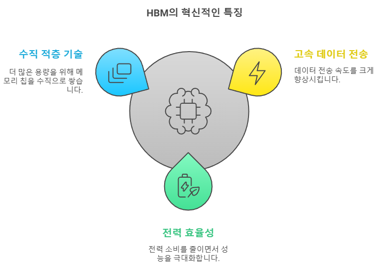 HBM(High Bandwidth Memory)은 차세대 메모리 기술로, 기존 DRAM보다 훨씬 빠른 속도로 데이터를 전송할 수 있는 고성능 메모리입니다.