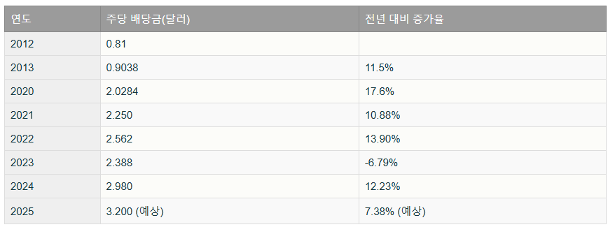 - 배당 성장률: 지난 10년간 연평균 12~13%의 배당 증가